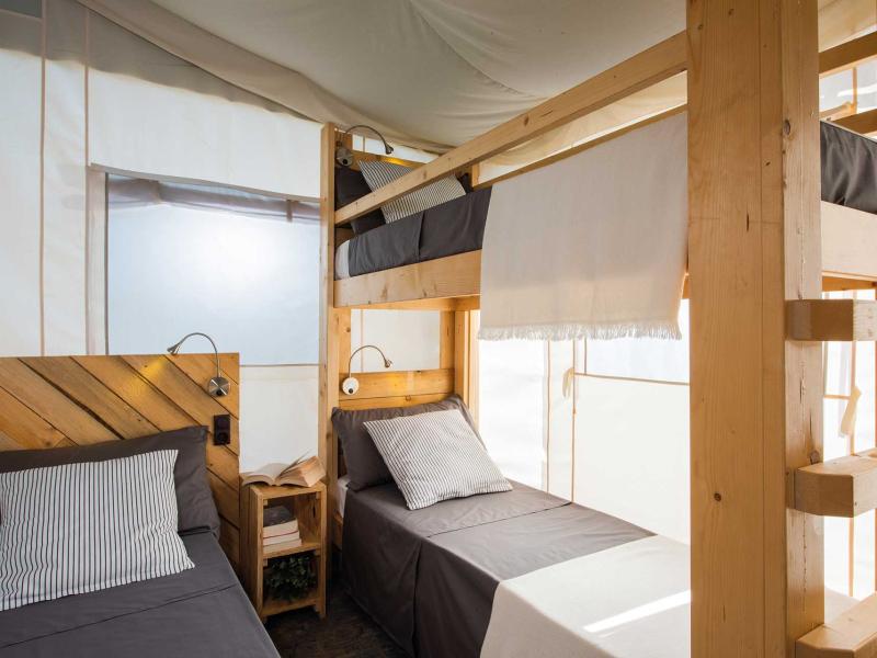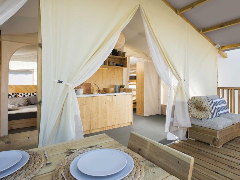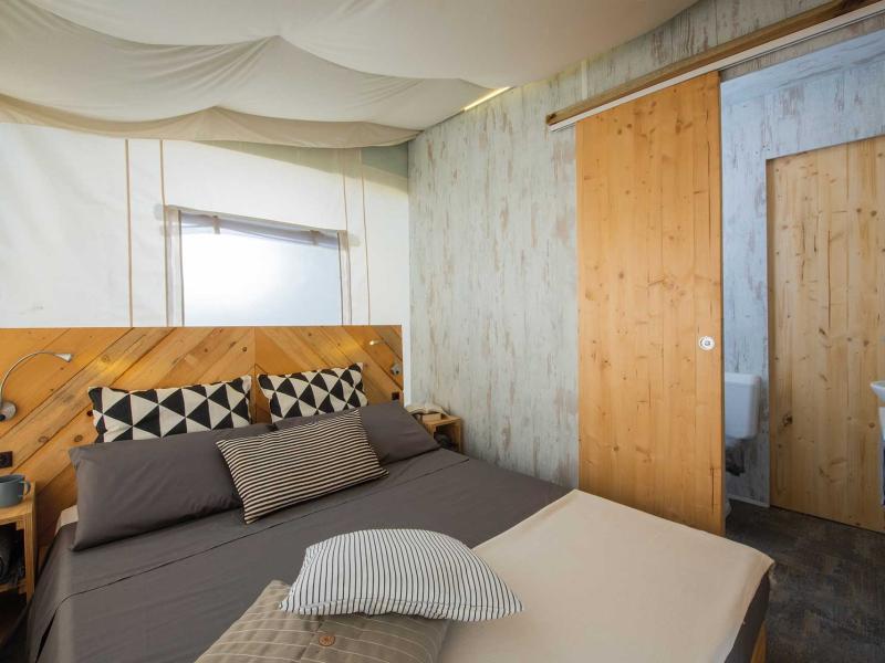 Die Unterkunft ist eine Mischung aus Mobilheim und Zelt, gemütlich und zugleich sehr natürlich. Der Holzboden ist leicht vom Boden abgehoben, damit bei Regen keine Probleme entstehen. Es haben bis zu 5 Personen Platz.